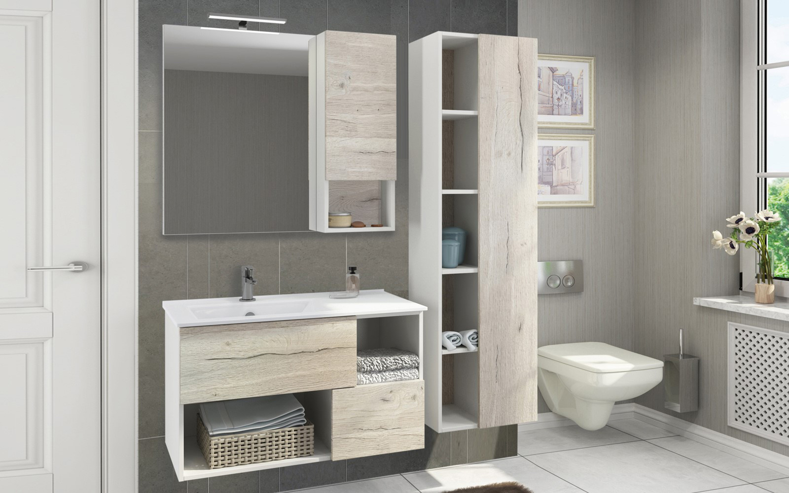 Для небольших ванных комнат есть мебель шириной 50-60см. Это коллекции Прага, Рига, Дублин, Тулуза, Ницца, Рим. Состоят из тумбы-умывальника, шкафа-колонны и зеркального шкафа. Линейка шириной 70-75см – это изящная мебель в средиземноморском стиле. Комплекты 80-90см более разнообразны по исполнению. Есть фасады с черным глянцем (Кельн) и с покрытием под бетон (Эдинбург), а также комплекты в стиле классика и барокко (Лувр, Версаль). Самые габаритные – комплекты 100-120см с колоннами и полуколоннами. Можно окружить себя атмосферой Милана, Турина или Сочи.