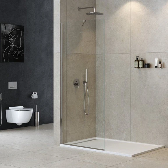 Свободный вход – это стеклянное полотно, отгораживающее пространство для душа. Устанавливается в углу или в произвольном месте вдоль стены. Обеспечивает «свободных вход» с одной или даже с обеих сторон. Выглядит воздушно, современно и очень элегантно.