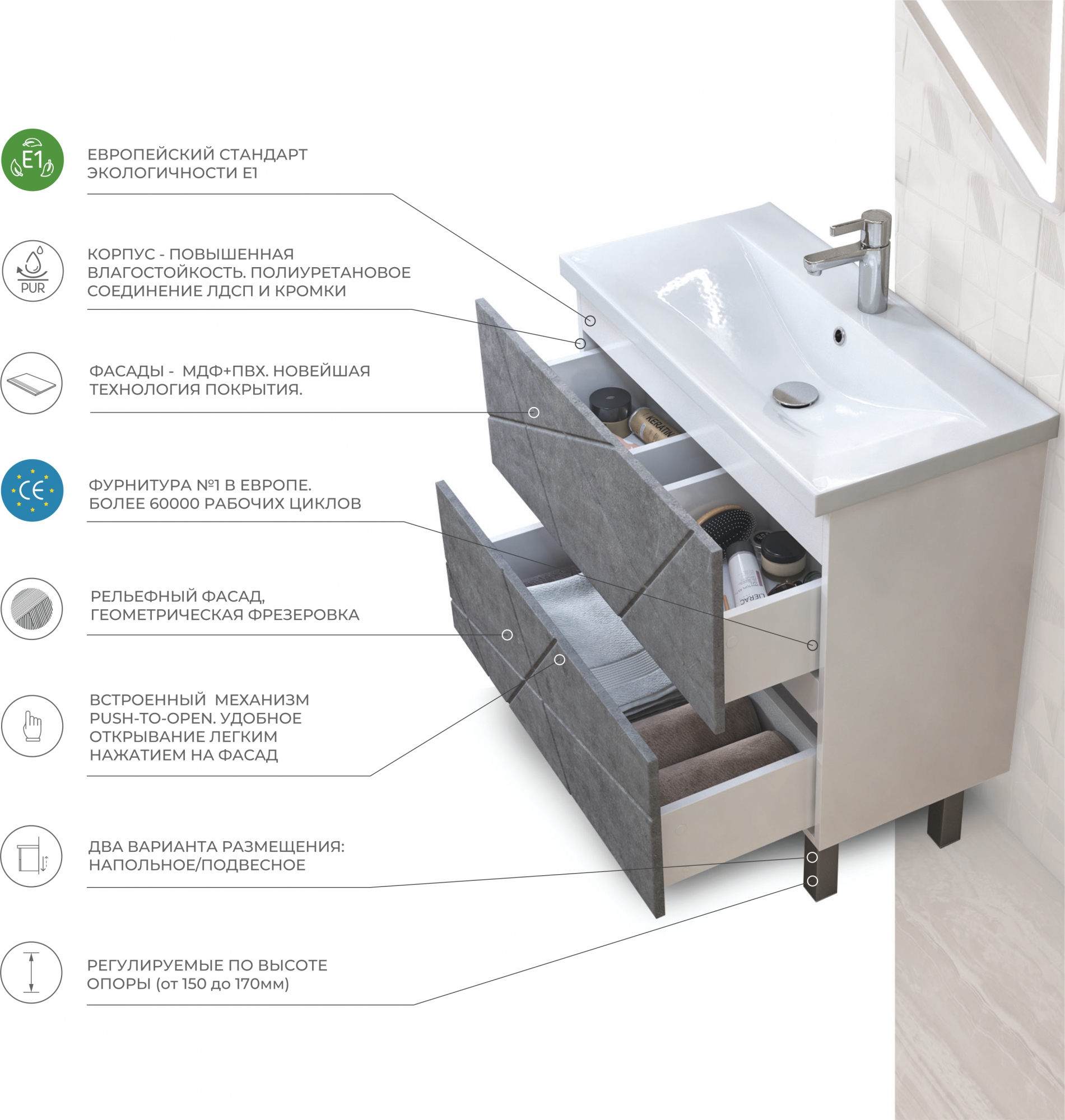 Монтаж мебели для ванной комнаты может быть напольным либо подвесным.