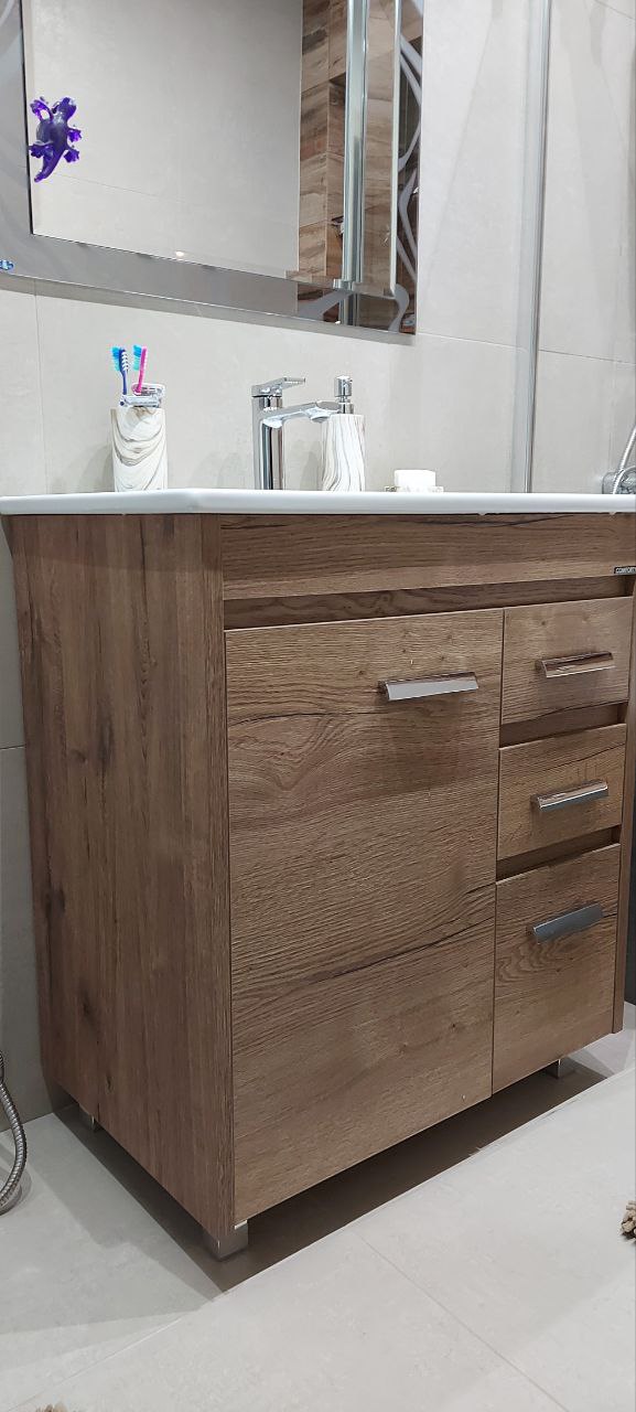 Напольная тумба-умывальник шириной 76 см с одной распашной створкой и тремя выдвижными ящиками. Створка оснащена петлями с плавным закрыванием. За створкой одна горизонтальная полка. Корпус и фасады тумбы выполнены из влагостойкого лдсп декорированного под натуральную древесину - дуб темный.